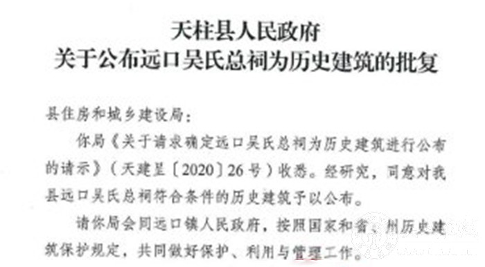 关于对天柱县远口吴氏总祠确定为历史建筑的公示